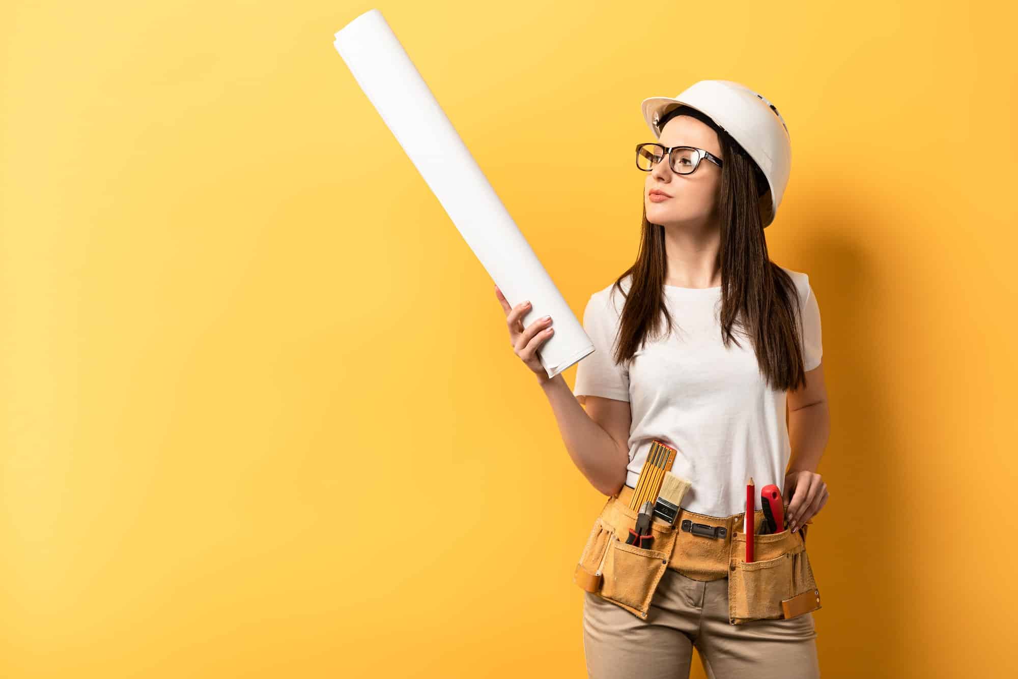 thoughtful handywoman holding and looking at blueprint on yellow background